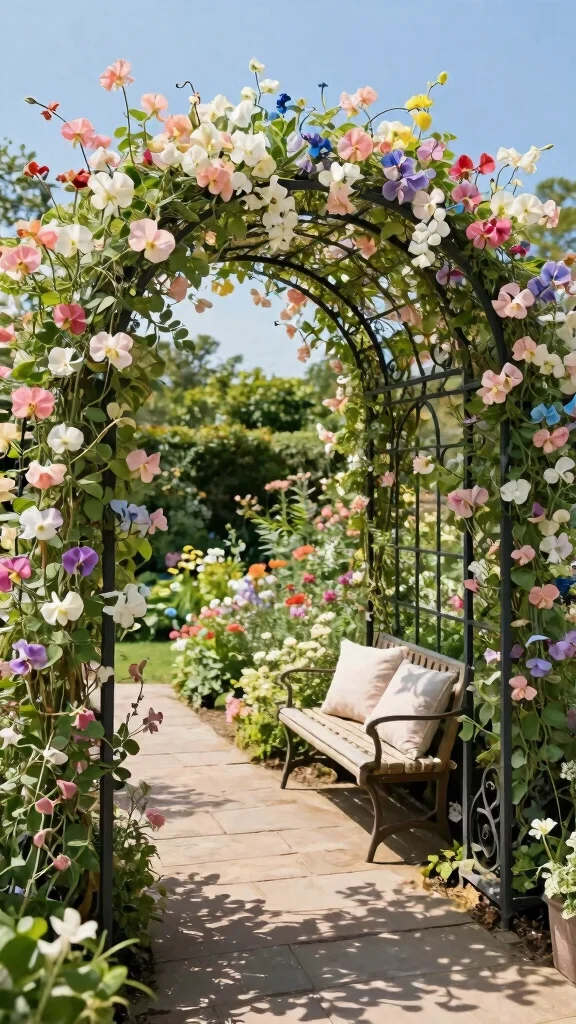 This design encourages you to enjoy your garden fully, surrounded by the beauty and fragrance of your sweet peas.