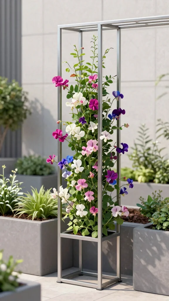 To create this chic look, choose a metal trellis with clean lines that allows sweet peas to climb freely. Position it against a wall or within a container garden to enhance its stylish display. Keep the area tidy to emphasize the trellis’s sleek design and consider pairing it with geometric planters for a cohesive aesthetic.