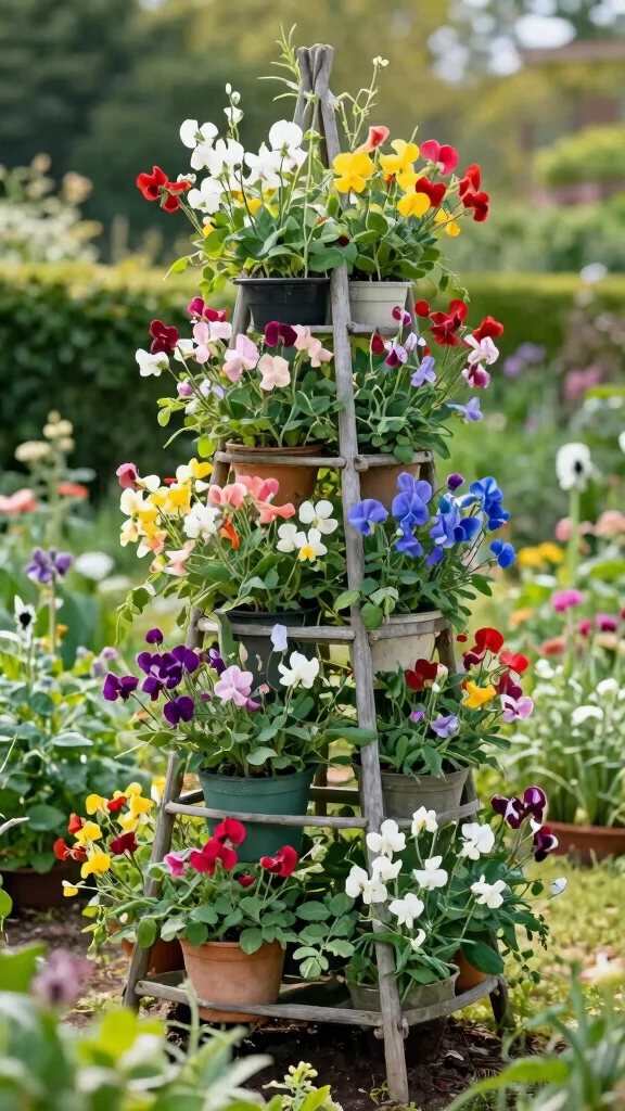 Maximize your vertical space with a tiered vertical trellis that showcases various sweet pea varieties beautifully. This design is perfect for small gardens or patios, providing a striking layered effect that draws the eye upward. A tiered trellis not only saves space but also adds visual interest to your garden.