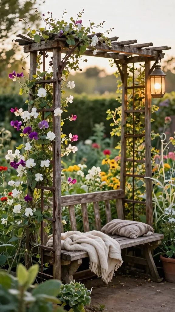 To achieve this inviting look, start by selecting reclaimed wood for authenticity. Build a sturdy A-frame or a vertical grid to support those vibrant sweet peas. Think about adding hooks for herbs or small pots, and don’t forget stringing fairy lights for that magical evening glow.