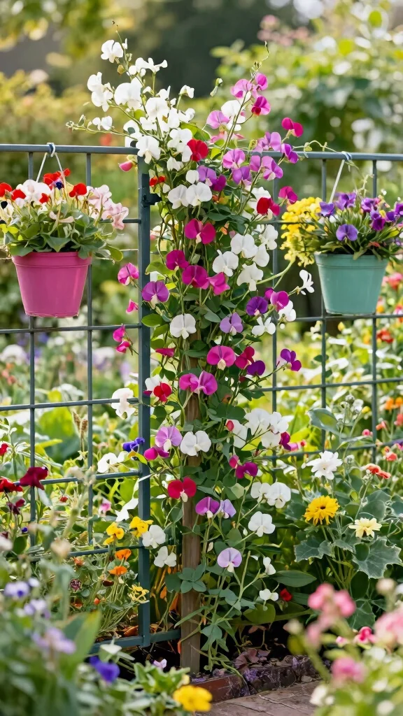 Fun fact: Wall-mounted trellis planters can double your sweet pea trellis ideas space in a compact patio, letting blooms climb upward instead of crowding your floor. With smart planters and color-matched walls, your vertical display stays organized and wildly romantic.