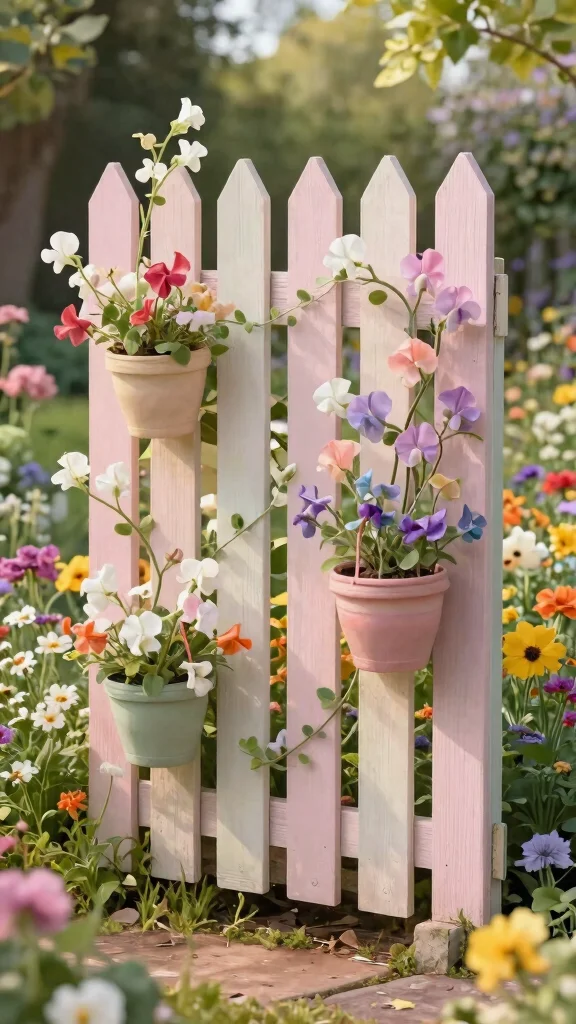 Create a delightful DIY picket fence trellis that combines functionality with adorable aesthetics. This design is perfect for small gardens, offering both privacy and an attractive climbing space for your sweet peas. A charming picket fence enhances the character of your garden while serving a practical purpose.