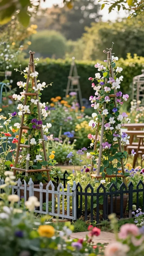 Transform an ordinary garden fence into a stunning trellis by incorporating sweet peas along its length. This practical design not only supports these lovely vines but also enhances the overall aesthetic of your garden space. A decorated fence becomes a vibrant backdrop, adding life and color.
