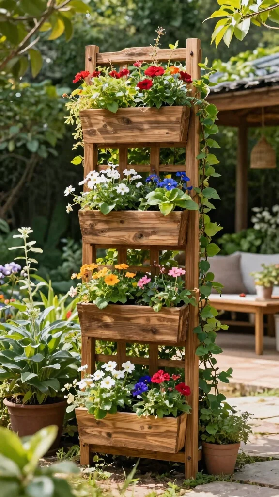Select durable wood types like cedar or redwood for longevity and design different heights for visual interest. Pair with flowering plants for seasonal beauty throughout the year.