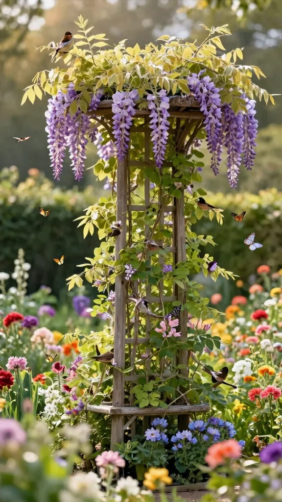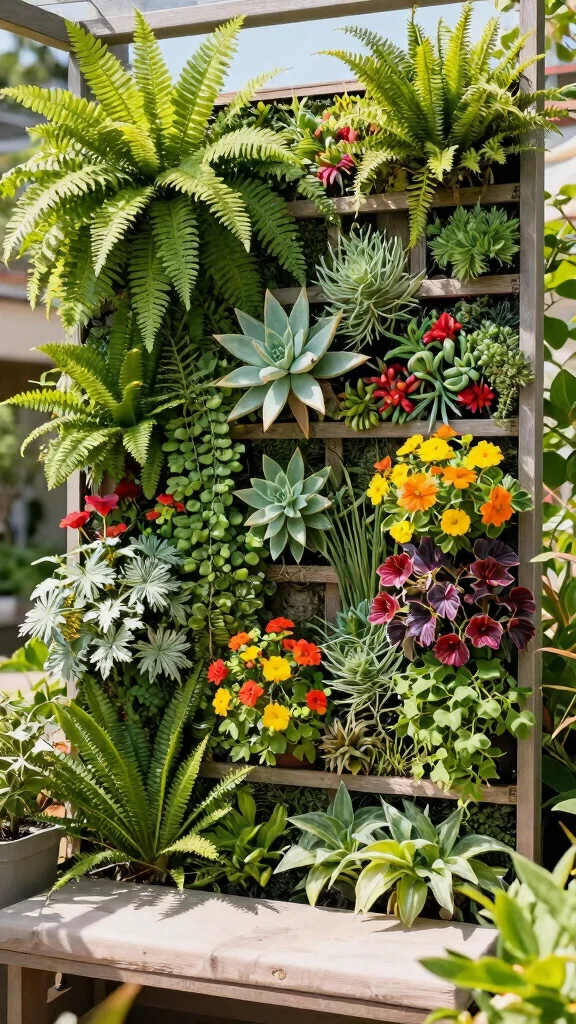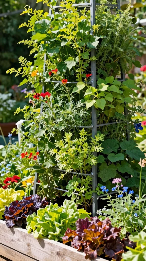 Consider mixing edible plants like cherry tomatoes and cucumbers for a beautiful and functional display. Use strong materials, such as treated wood or metal, to support heavier crops. Vary the heights of your plants for a visually striking layered effect.