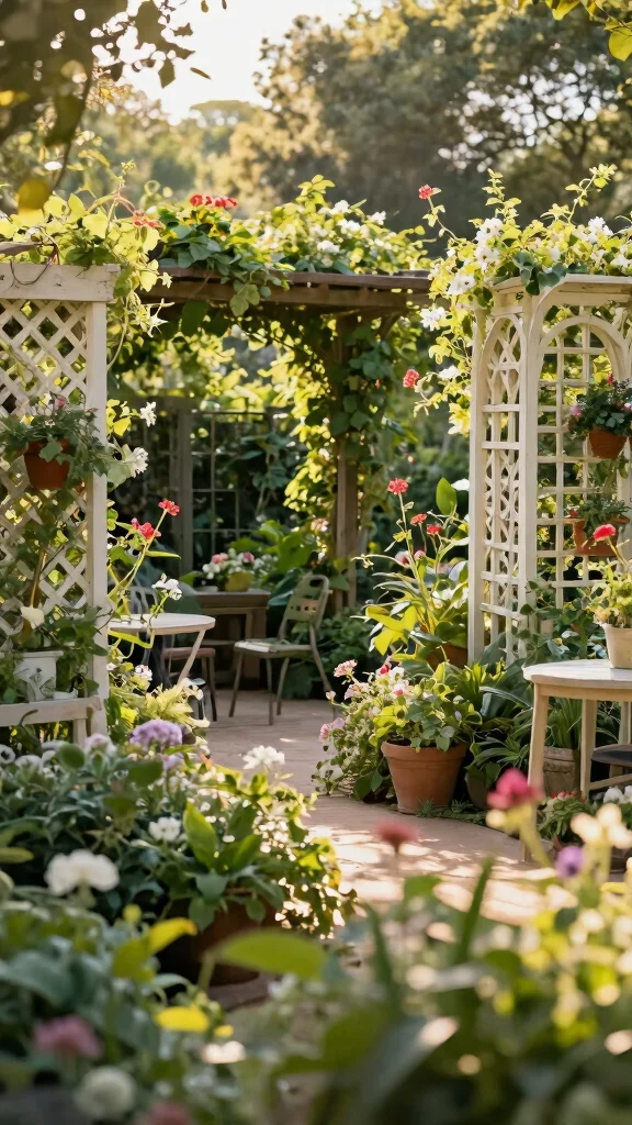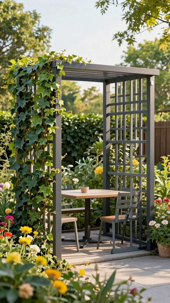 Vertical gardening techniques thrive with trellises because you stack greenery upward. Start with a slim freestanding trellis beside a seating area, add a vertical planter along the wall, and train climbers to cover the framework. Use adjustable panels to change screening height as plants grow, keeping the area versatile. This approach delivers privacy through living walls and architectural elements without crowding the ground space.