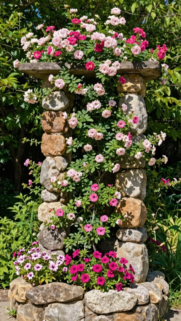 Use a mix of stone sizes for a more organic appearance and ensure proper drainage for the plants at the base. Adding flowering vines can create beautiful blooms against the stone surface.