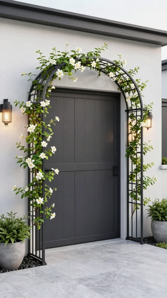 Start with trellis styles that match your home’s architecture and scale them to the door opening. Choose a color or wood stain that complements the siding, and pick climbing plants that provide year-round structure plus seasonal color.