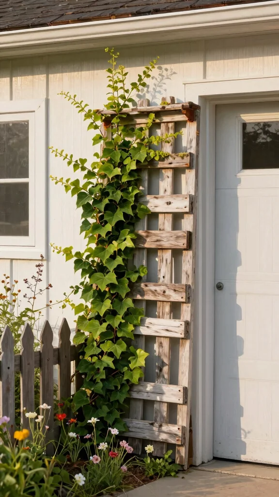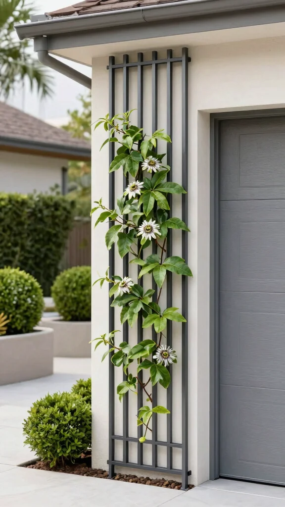 Fun fact: A vertical strips trellis boosts curb appeal with clean lines—great for trellis over garage door setups. Install thin wooden or metal strips in parallel, then train climbing plants like passionflower for easy care and striking contrast.