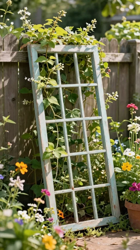 Transform an old window frame into a beautiful trellis that brings vintage charm to your garden. This delightful design allows climbing plants to showcase their beauty while adding a touch of history.