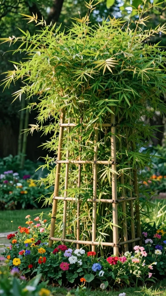 Fun fact: Bamboo trellises are usually 40% lighter than metal ones yet incredibly sturdy, making upcycled garden ideas practical and chic. With varying heights and a simple grid, you can train climbers quickly and realize unique trellis ideas for a lush, exotic vibe.