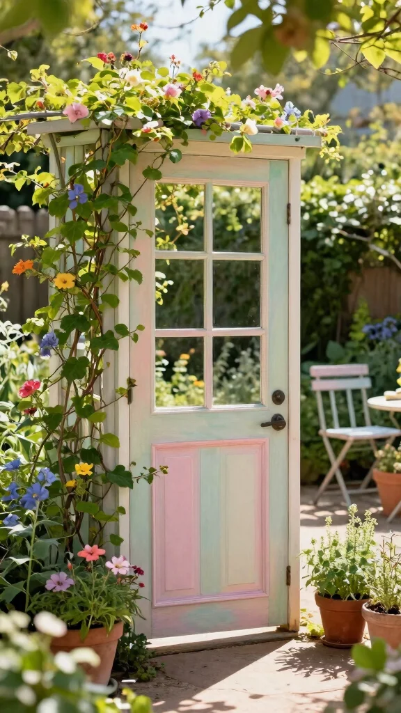 Start by choosing a door with an interesting design and clean it well. You can add a fresh coat of outdoor-safe paint to revive its look. Secure the door upright in your garden, allowing plants to weave through its panels for a stunning display.