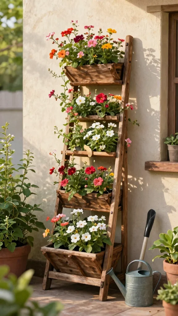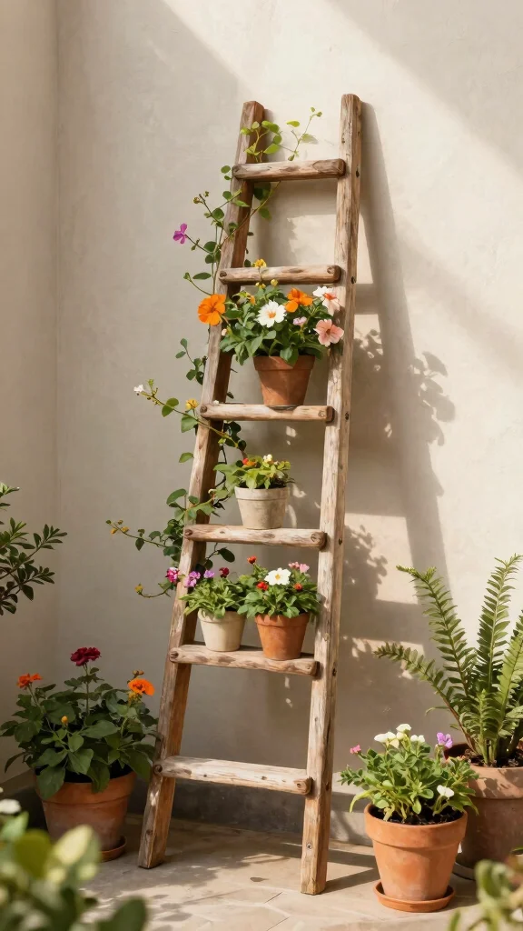 Transform an old wooden ladder into a stunning trellis that not only supports your plants but also adds rustic charm to your garden. Leaning a ladder against a wall offers multiple levels for plants to climb and flourish.