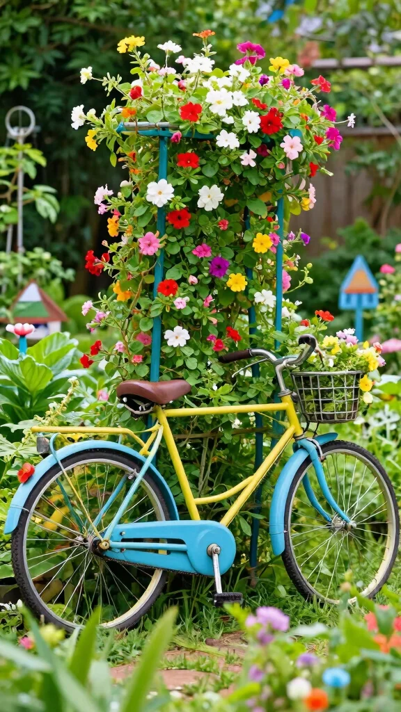 Give an old bicycle frame a new life by using it as a quirky trellis that adds a unique focal point to your garden. This creative approach not only recycles materials but also supports your climbing plants with style.