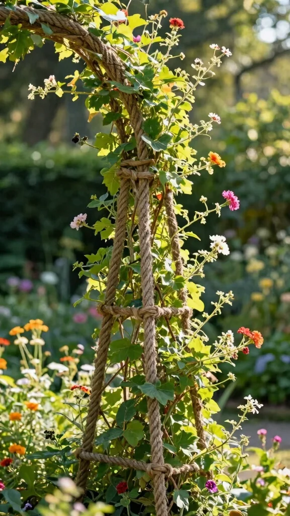 Craft a unique trellis using twisted rope for an organic aesthetic that fits perfectly in natural settings. This innovative design can be shaped into various patterns, providing an interesting support system for climbing plants.