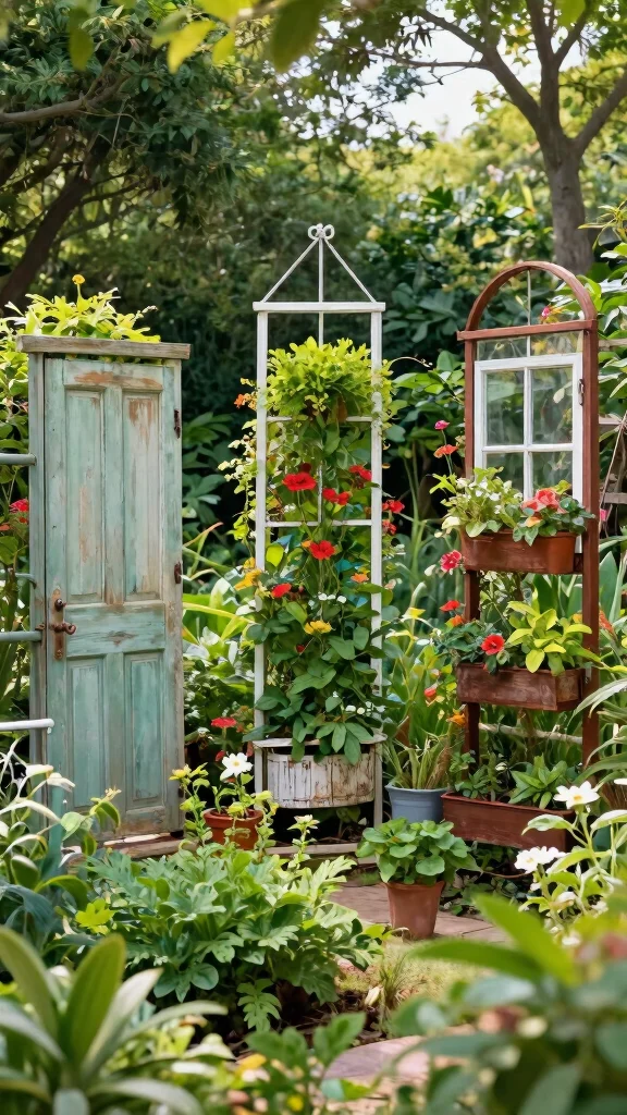 Give an old door a new purpose by turning it into a whimsical trellis that enhances your garden’s charm. Vintage doors bring a unique character to your outdoor space, creating an enchanting backdrop for climbing plants.